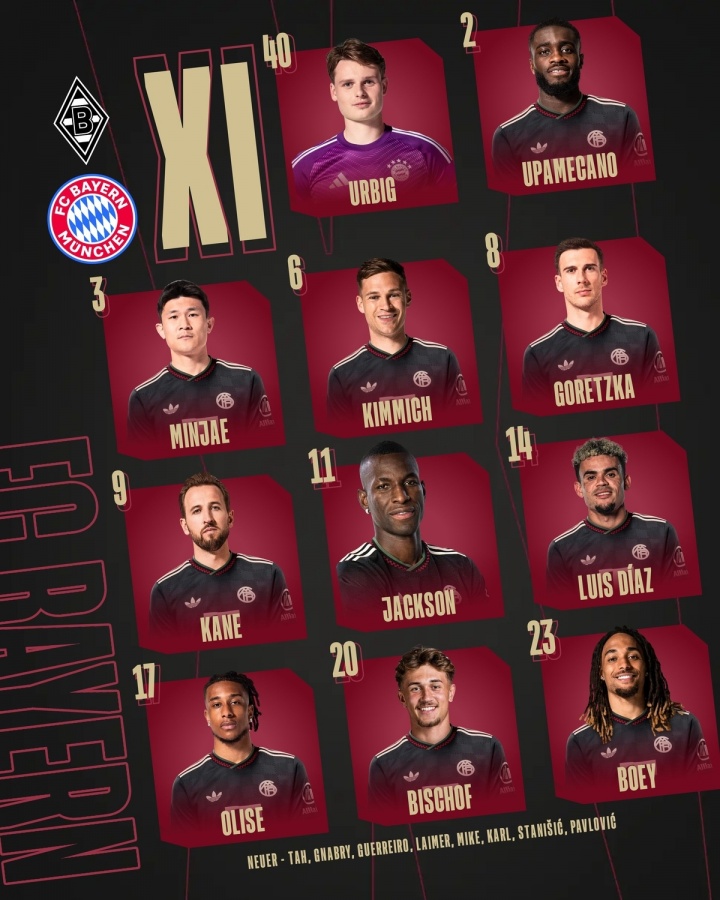 拜仁客战门兴首发:凯恩、杰克逊、比朔夫先发,金玟哉、博伊出战